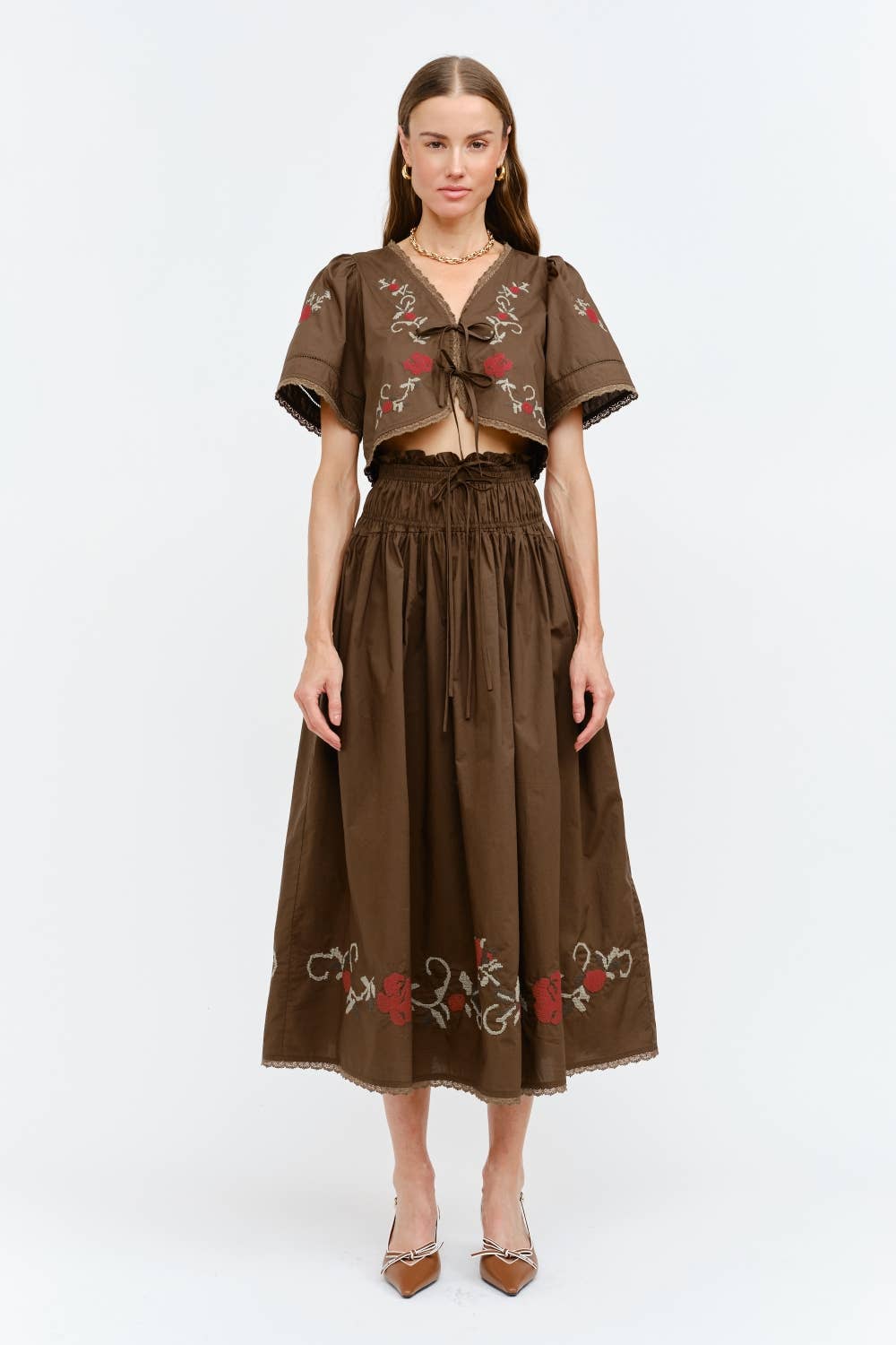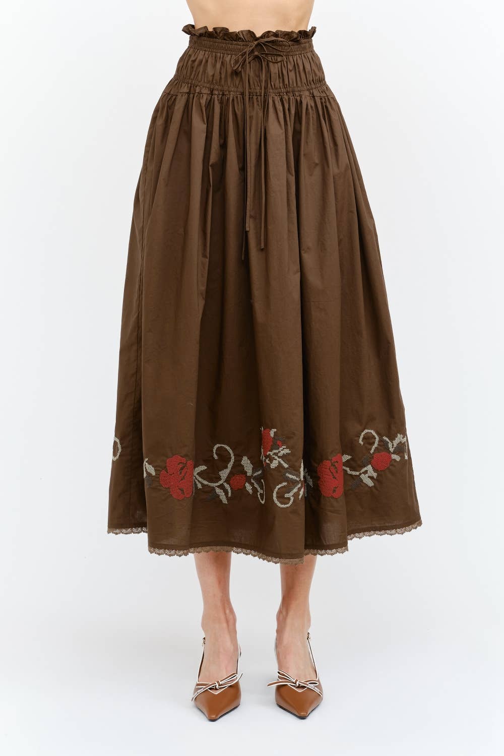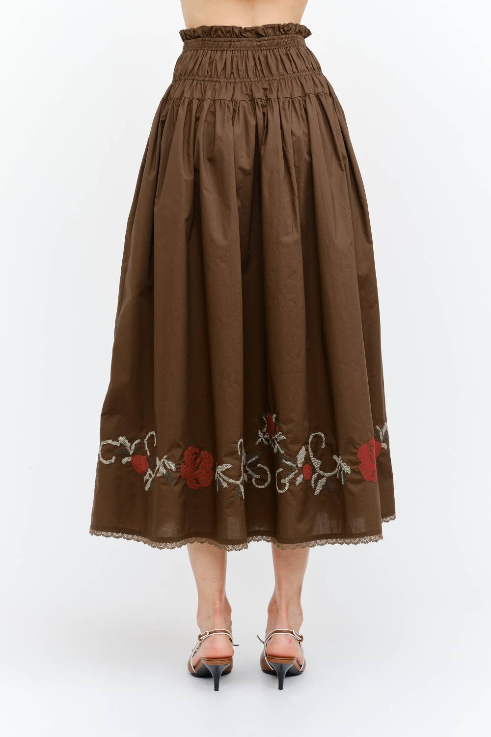Sivan Brown Skirt A charming blend of vintage romance and modern femininity, this embroidered midi skirt is a standout piece for any season. Crafted with a smocked waistband for a flattering high-rise fit, it features delicate ruffle trim and a soft A-line silhouette that falls gracefully below the knee. The hemline is beautifully adorned with bold floral embroidery in rich red and sage green, adding just the right touch of artisan detail.