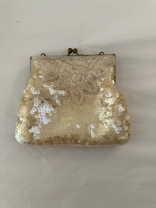 Vintage Cream Sequin Beaded Purse w/ Chain