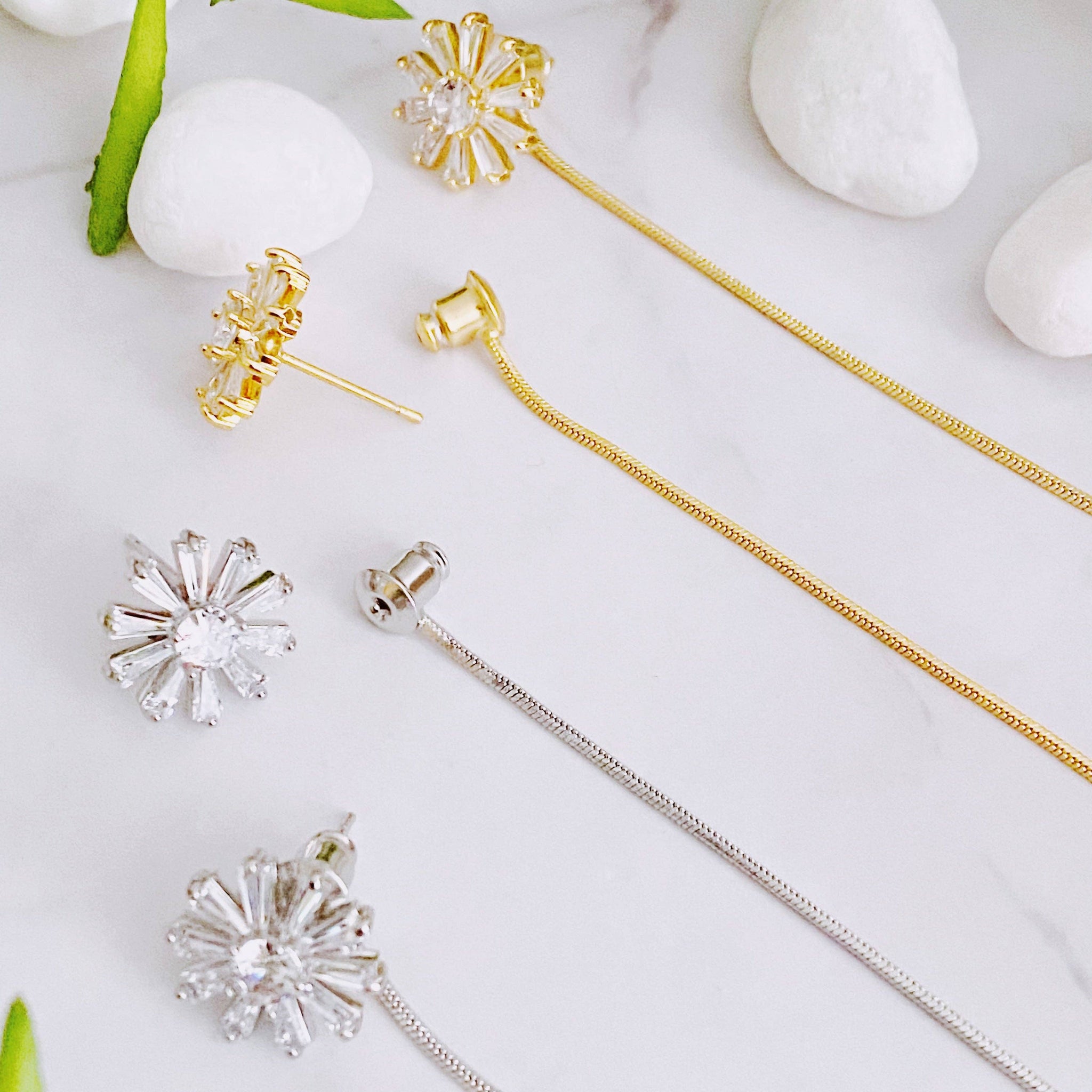 These Edelweiss Backdrop Earrings feature a precious small sparkly flower stud paired with a simple chain dangle back, creating a versatile look that can be worn as a stud or with the backdrop. Elevate any ensemble with these dazzling earrings.